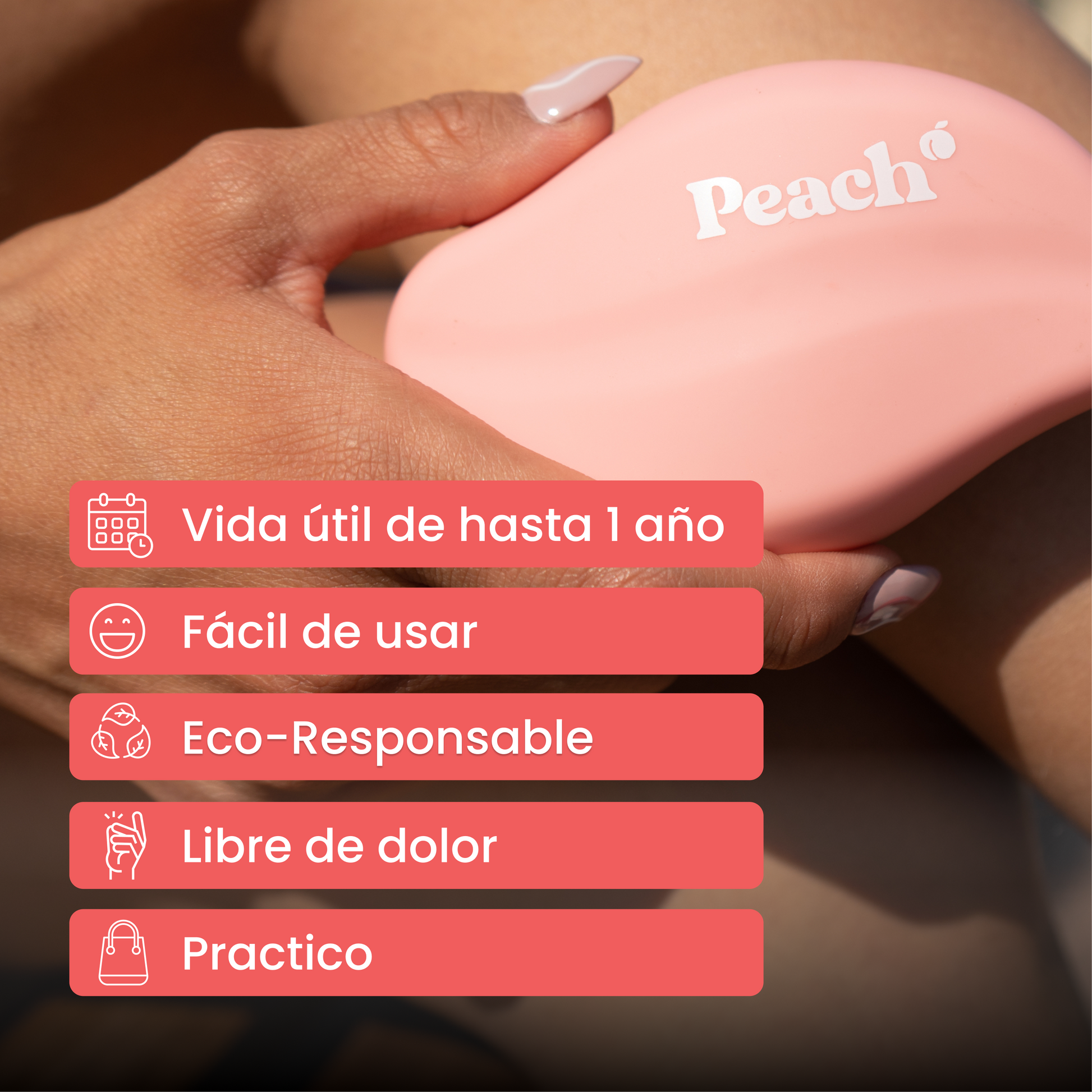 Una piel libre de vello jamás había sido tan fácil de lograr como con Peach. Nuestro borrador de vello se encarga de asegurarte una piel libre de vello y súper suave en segundos.